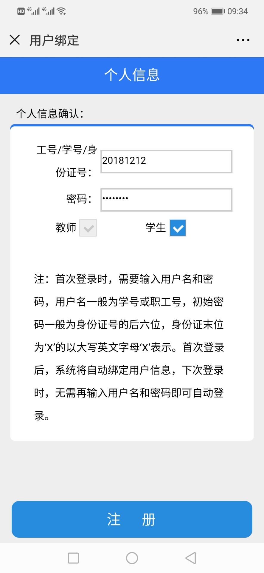 3.输入账号密码:账号为学号,密码为身份证后六位(如果没有身份证,密码为学号);“学生”打勾,点击注册。