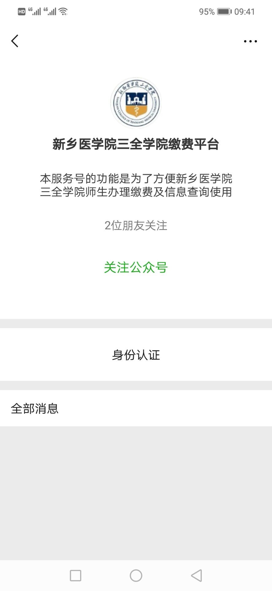为了更好地服务全校师生,2019年3月起,财务部微信缴费系统正式上线,同学们可以通过该系统办理学杂费交纳业务。 同学们只需关注“新乡医学院三全学院缴费平台”公众号,登录其缴费平台进行简单操作,就可以实现自助缴费。系统启用后,同学们足不出户就可以通过手机网络完成缴费手续。 具体操作步骤如下: 1.搜索并关注微信公众号“新乡医学院三全学院缴费平台”。