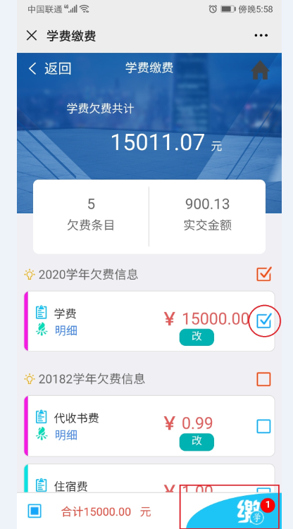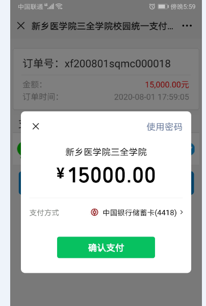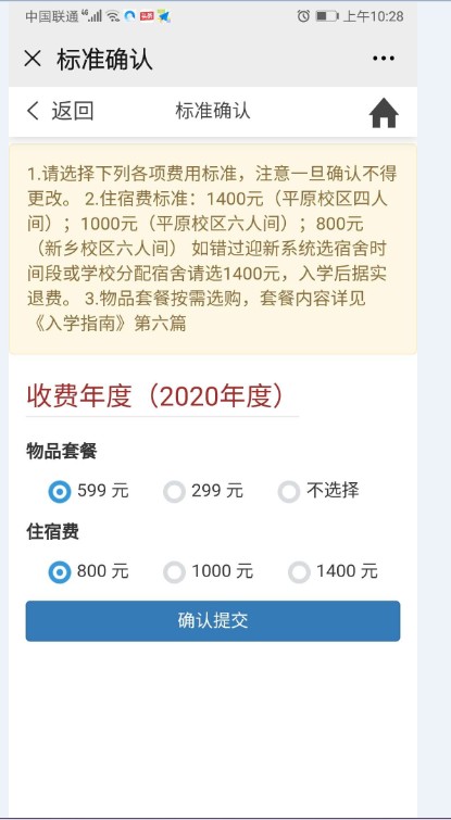 一、缴费地点及时间 1.我校新生学杂费收取地点新乡校区设在馨飨苑餐厅对面校园卡管理中心,平原校区专升本、本、专科学生设在学生事务服务中心、仁智书院、羲和书院、精诚书院、崇德书院、德馨书院、智行书院共七个收费点,现金收费口设在学生事务服务中心,请各位同学、家长注意资金安全,不要将现金﹑银行卡等交给陌生人; 2.现场缴费时间:2020年9月14日-9月18日(7:00--18:30); 3.配合学校维护缴费通道及缴费处秩序,不要拥挤、不要喧嚣,注意人身及财产安全。 二、缴费项目 1.学费:按学生录取通知书上标明的金额收取。 2.住宿费:新乡校区:6人间800元/生/年,4人间1000元/生/年; 平原校区:6人间1000元/生/年,4人间1400元/生/年 住宿费按照实际住宿情况多退少补就。 3.教材费:按本科生1200元,专科、专升本学生700元进行预收,学期结束后据实结算,多退少补。 4.白大衣费用:口腔、眼视光专业59元/套;助产、护理119元/套;剩余其他专业63元/套。 5.军训服:76元/套。 6.体检费:48元/生。 7.物品套餐费:分两类,价格分别为:299元/套、599元/套。 三、缴费方式 (具体缴费流程详见:新乡医学院三全学院校园统一支付平台自助缴费步骤) 2.银行代扣: 已通过银行代扣完成学杂费缴纳的学生,缴费票据已放入个人资料袋中,学生不用再排队缴费,可以直接办理其他手续。